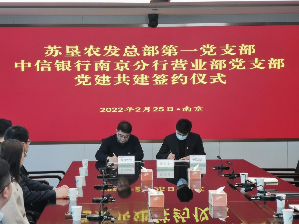 2月25日,蘇墾農發總部第一黨支部與中信銀行南京分行營業部黨支部舉行黨建共建簽約儀式。簽約前,蘇墾農發總部第一黨支部書記劉剛和中信銀行南京分行營業部黨支部書記張磊各自介紹了支部基本情況,并就黨員隊伍建設、黨建工作開展以及黨建業務融合促進等方面內容作交流。隨后,雙方代表簽訂《黨建共建協議書》,并互贈黨建書籍。