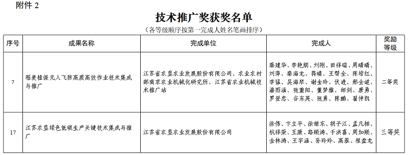 12月11日,第六屆江蘇省農(nóng)學會科技獎勵成果獎和第六屆江蘇省農(nóng)學會科技獎勵人才獎獲獎名單公布,蘇墾農(nóng)發(fā)作為第一完成單位申報的“稻麥植保無人飛防高質(zhì)高效作業(yè)技術(shù)集成與推廣”成果榮獲技術(shù)推廣獎二等獎、“江蘇農(nóng)墾綠色低碳生產(chǎn)關(guān)鍵技術(shù)集成與推廣”成果榮獲技術(shù)推廣獎三等獎,蘇墾農(nóng)發(fā)現(xiàn)代農(nóng)業(yè)研究院朱松同志榮獲青年科技獎。
